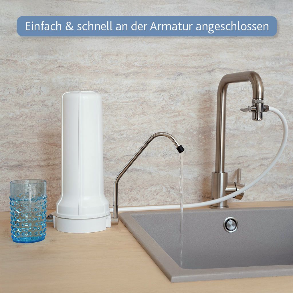 Mit dem Alvito Auftisch-Wasserfilter Basic bekommst du frisches, gefiltertes Wasser direkt aus deinem Wasserhahn – schnell angeschlossen und einfach zu bedienen. Ideal für Zuhause oder unterwegs, zum Beispiel in der Ferienwohnung.
